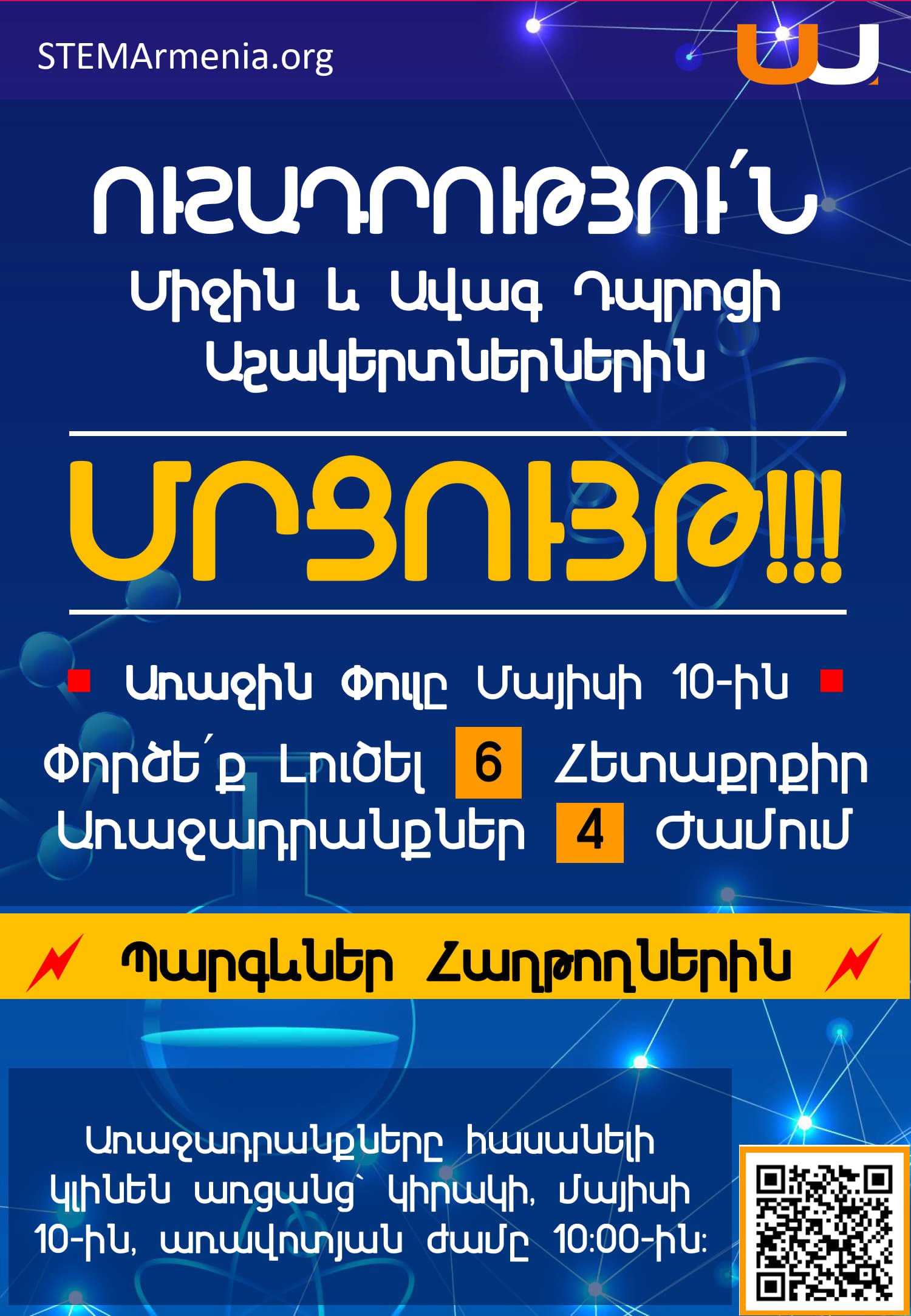 1. «ՍՏԵՄ Արմենիա | Մայիս 2026» մրցույթի առաջին փուլը տեղի կունենա կիրակի՝ մայիսի 10-ին: Վեց քննադատական մտածողության առաջադրանքներ պետք է լուծվեն չորս ժամվա ընթացքում: