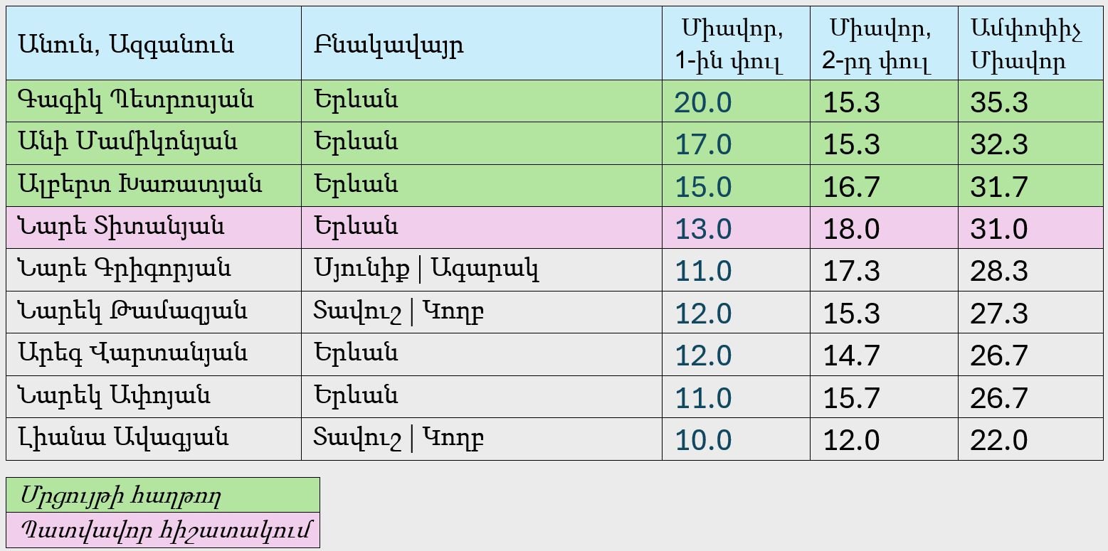 | Անի Մամիկոնյան | 17 | Երևան | Երևան | 14 | Գլոբալ Բրիջ |
